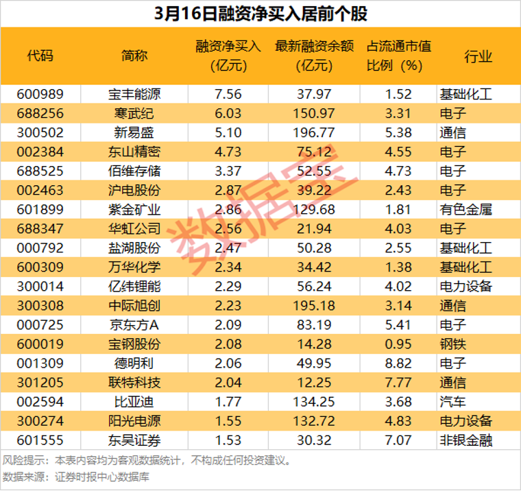 统计显示,具体到个股,3月16日共有1905股获融资净买入,净买入金额在千万元以上的有535股,其中42股融资净买入额均超1亿元。
