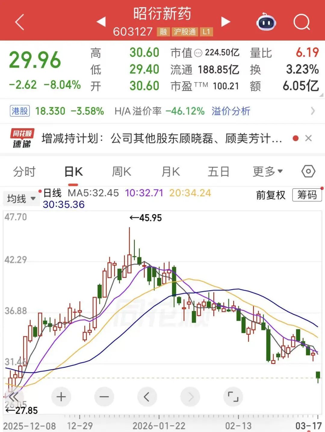 创新药龙头昭衍新药发布股东减持计划,股东顾晓磊及其一致行动人顾美芳拟自减持计划公告之日起3个交易日后的3个月内,以集中竞价的方式分别减持2042.05万股、1032.2万股,合计减持3074.25万股,占公司当前总股本的4.1026%,减持完毕后上述两位股东将不再持有公司股份。今日该股低开后股价再度走低,最高跌超9%。