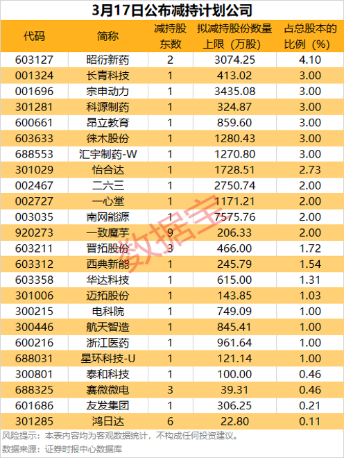 3月17日,24家公司发布了减持计划,拟减持比例居前的有昭衍新药、长青科技、宗申动力、科源制药等。
