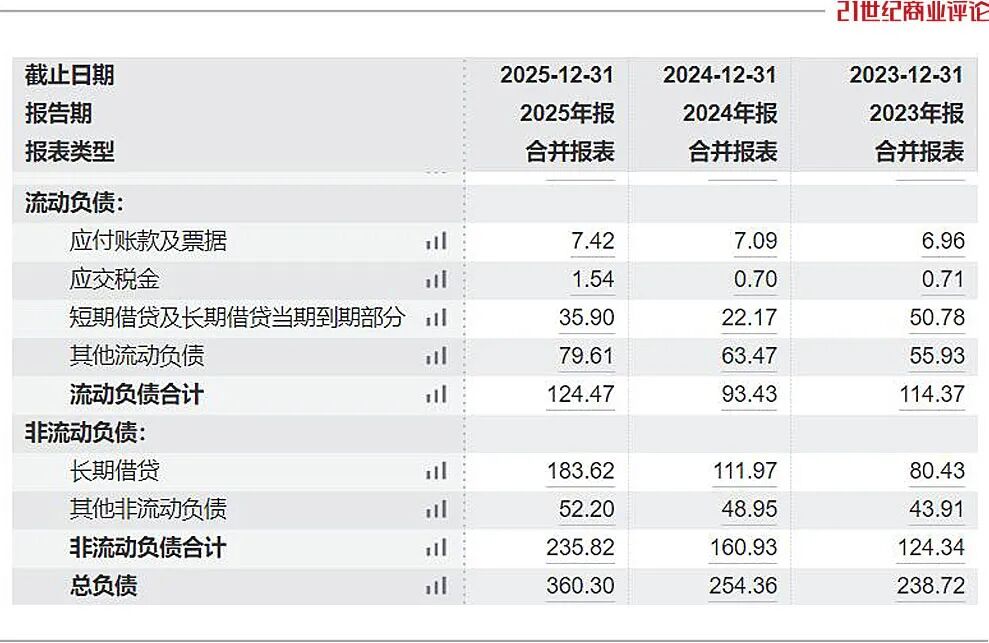 截至2025年底,总负债为360亿元,其中2026-2028年到期的短中期债务,合计占46.6%。