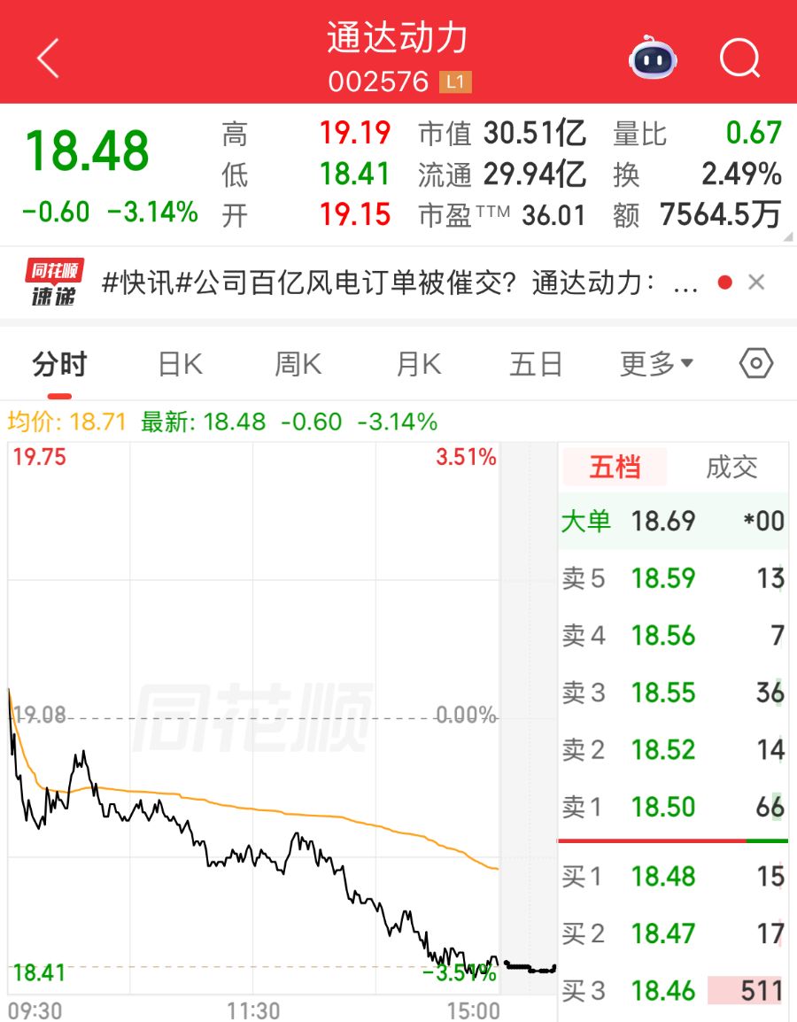 截至3月17日收盘,通达动力股价报18.48元/股,跌3.14%。