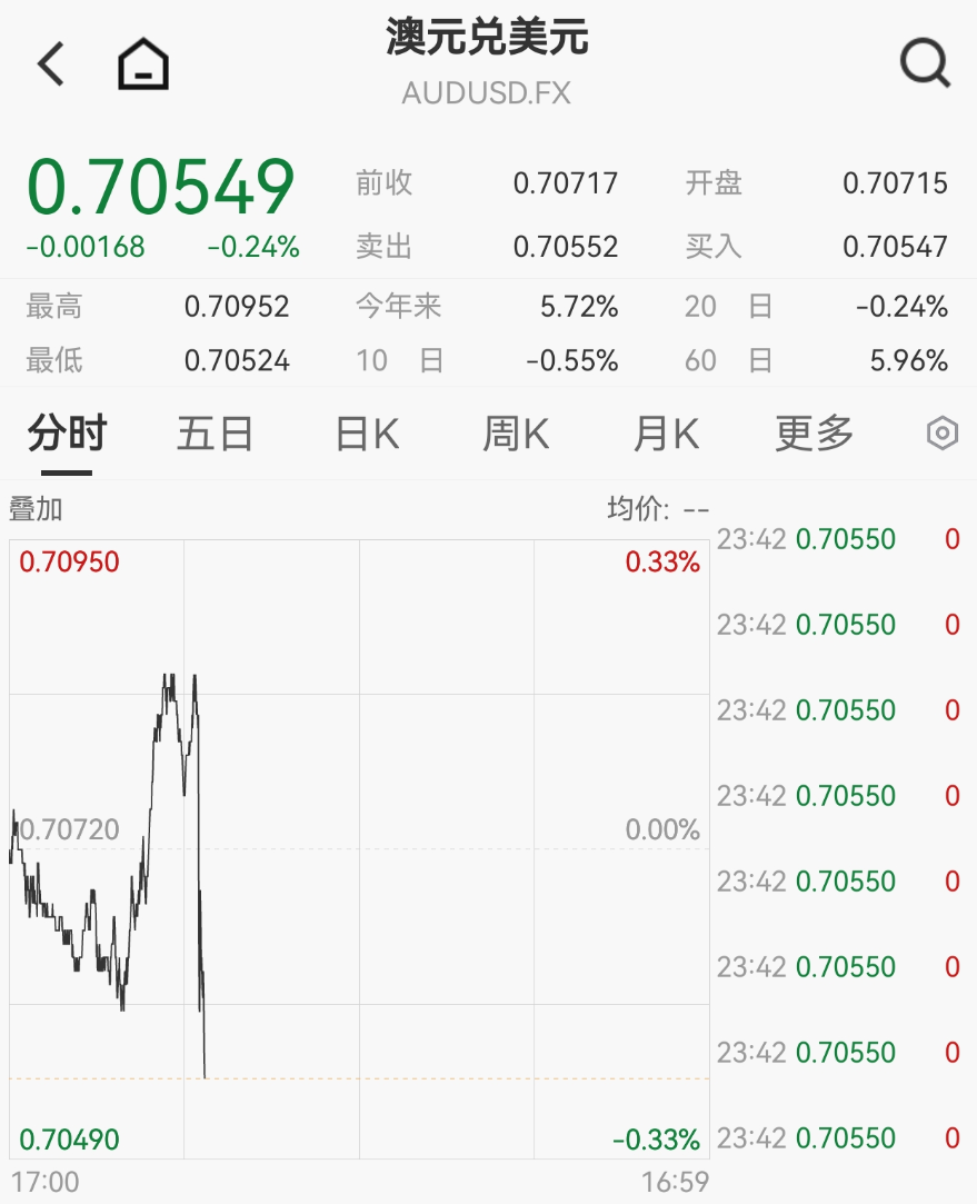 决议公布前,澳元兑美元小幅走高。而在加息消息明确后,澳元兑美元短线跳水。