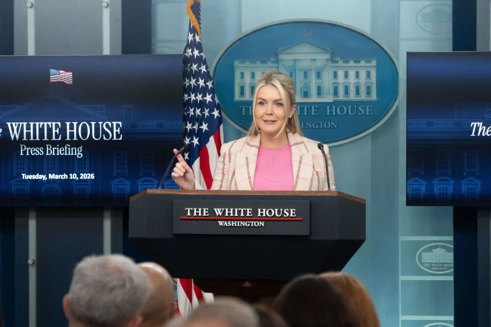 3月10日,在美国首都华盛顿,白宫新闻秘书莱维特出席记者会。美国白宫新闻秘书莱维特10日在记者会上说,美国海军目前没有护送任何油轮或其他船只通过霍尔木兹海峡。新华社发(李源清摄)