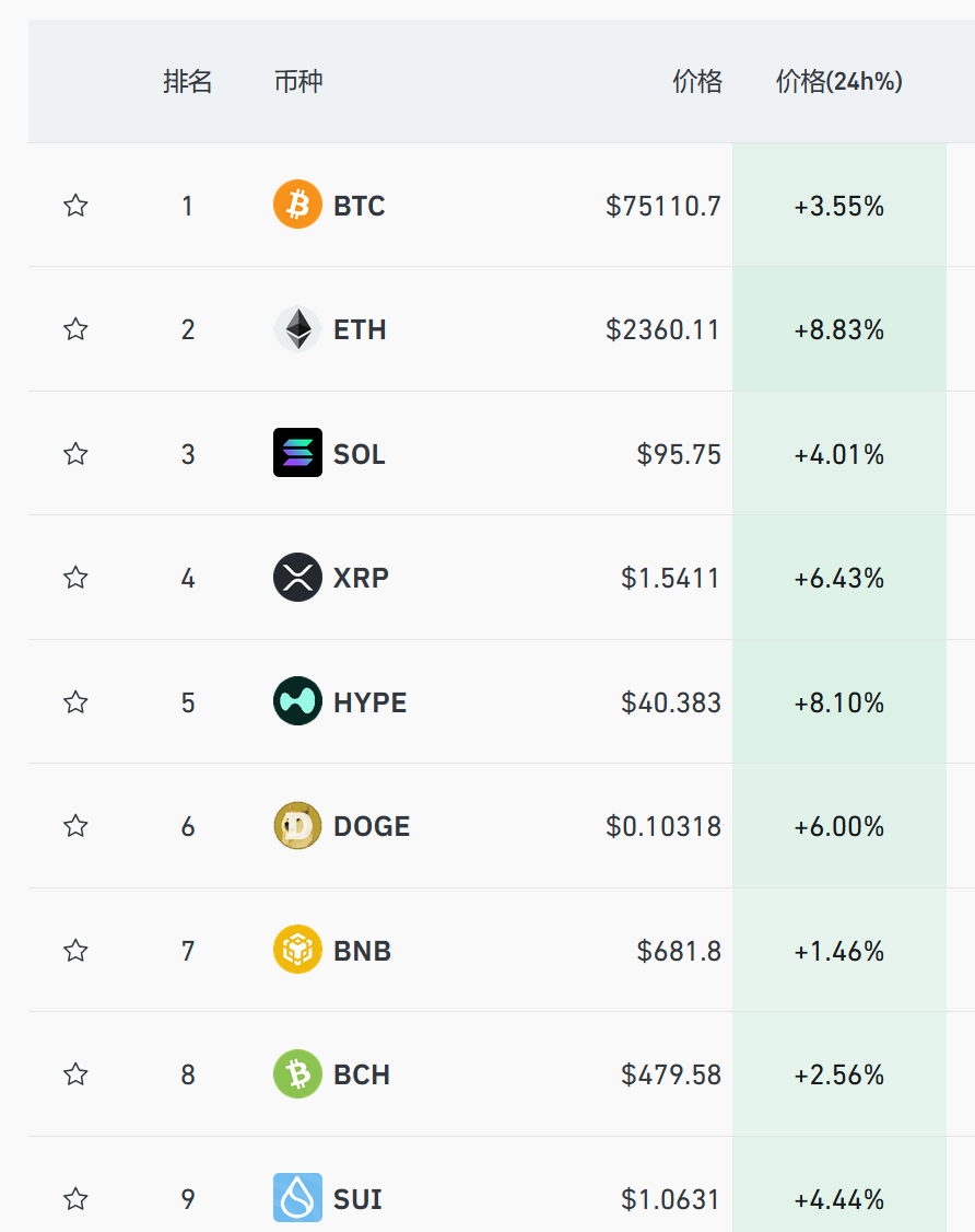 3月17日,加密货币市场集体大涨,比特币突破7.5万美元,日内涨幅超3%;以太坊突破2300美元,涨幅接近9%。SOL、XRP、狗狗币等同步走高。