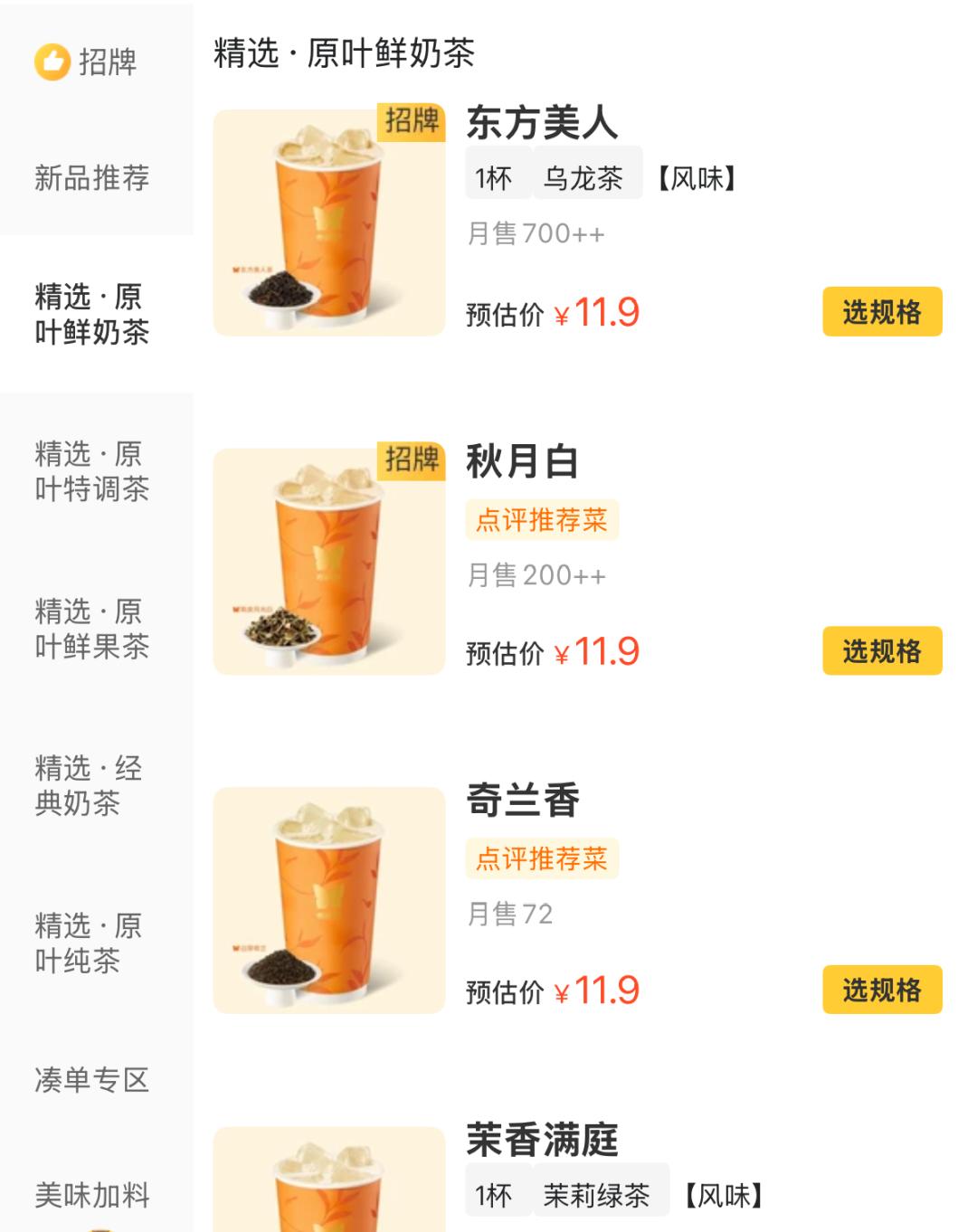 △图片来源:美团不同于以前尝试的无人自助奶茶店、快闪店,香飘飘在杭州开出的奶茶店主打原叶鲜泡茶,产品涵盖原叶鲜奶茶、原叶特调茶、原叶鲜果茶、经典奶茶、原叶纯茶等系列,一杯的定价介于5.9元到16元之间,人均消费在10元上下。