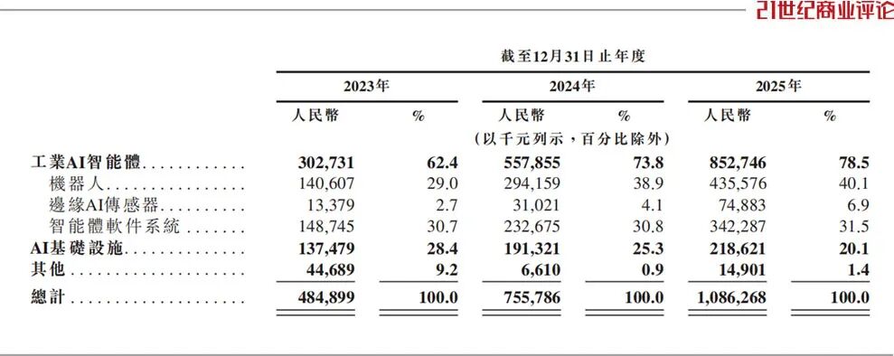 2025年,思谋营收为10.86亿元,工业智能体占比高达78.5%,主要通过独立软件授权及订阅服务,从智能体软件系统产生收入,自称中国规模最大的工业AI智能体提供商。