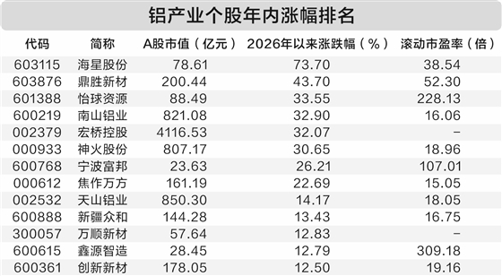 A股市场铝产业股票合计有31只,截至3月16日,合计A股市值为1.22万亿元。据证券时报·数据宝统计,今年以来,铝产业股票平均上涨12.51%,跑赢同期上证指数近10个百分点,海星股份、鼎胜新材、怡球资源、南山铝业、宏桥控股、神火股份累计涨幅均超30%。