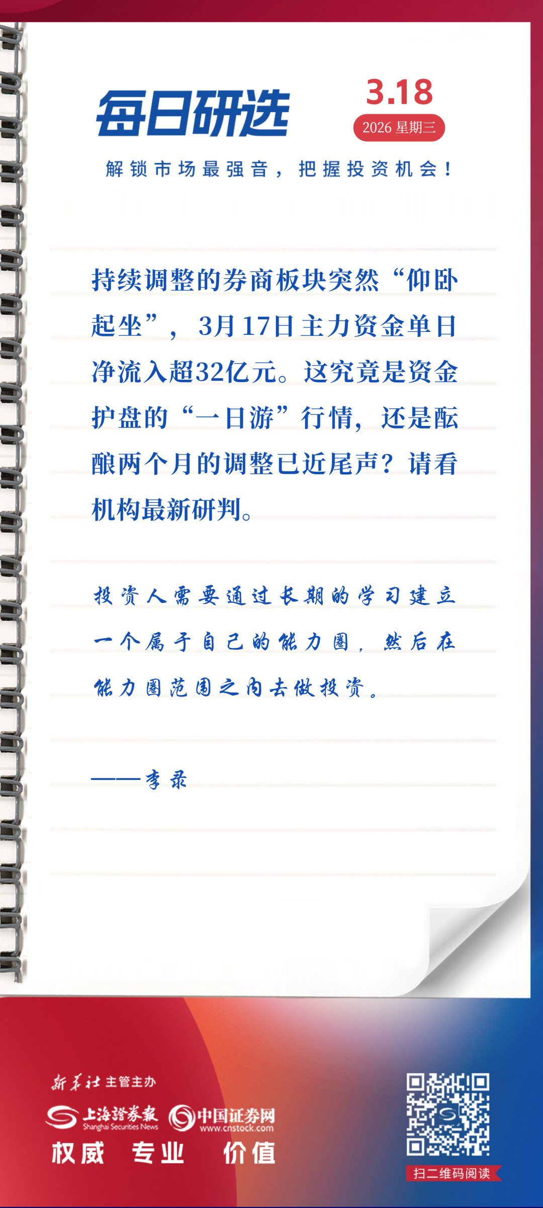 持续调整的券商板块突然“仰卧起坐”,3月17日主力资金单日净流入超32亿元。这究竟是资金护盘的“一日游”行情,还是酝酿两个月的调整已近尾声?请看机构最新研判。