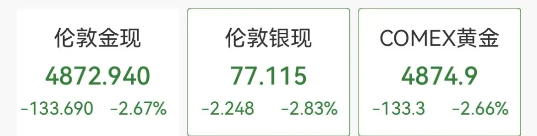 黄金、白银股普跌,哈莫尼黄金、金田跌超7%,泛美白银、科尔黛伦矿业跌超7%,金罗斯黄金跌超6%。消息面上,黄金、白银双双跳水,现货黄金跌破4900美元关口,最新报4872.9美元/盎司,现货白银跌至77美元/盎司。