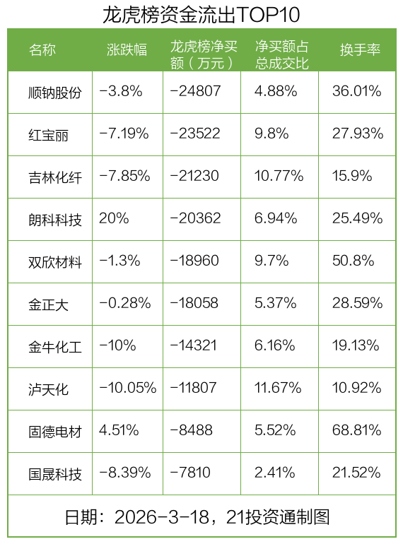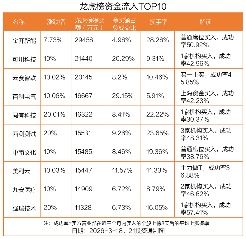 3月18日,上证指数上涨0.32%,深证成指上涨1.05%,创业板指上涨2.02%。盘后龙虎榜数据显示,共有51只个股因当日异动登上龙虎榜,资金净流入最多的是金开新能(600821.SH),达2.95亿元。