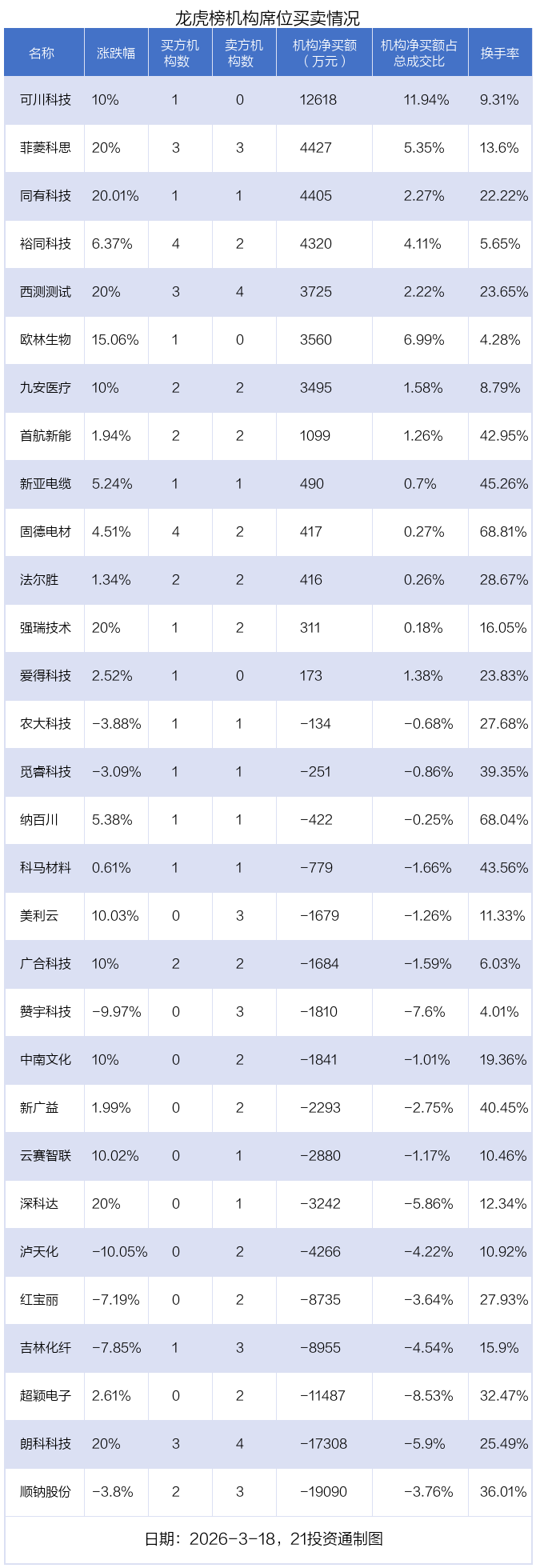 3月18日,30只个股龙虎榜出现了机构的身影,机构合计净卖出4.74亿元。具体来看,机构净买入13股,净卖出17股。