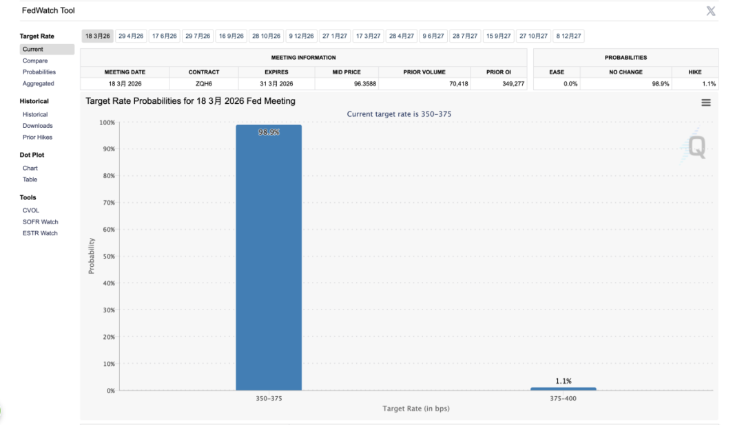 芝商所“美联储观察”工具显示,截至北京时间3月18日,市场预期美联储在本次会议上维持利率不变的概率为98.9%。