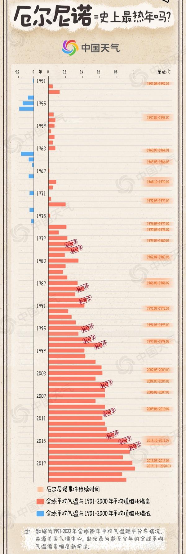 中国天气网统计气象大数据发现,厄尔尼诺擅长制造“暖冬”“史上最热”、暴雨洪涝等一系列极端天气气候事件,甚至引发全球性的气候异常。而且,厄尔尼诺往往也会加剧全球平均气温的升高,多次创下最暖纪录。在全球变暖的大背景下,厄尔尼诺的强度越强,对全球平均气温的提升也就越明显。比如2014年至2016年,厄尔尼诺的强度达到了超强级别,这三年全球平均气温连续创下新纪录。