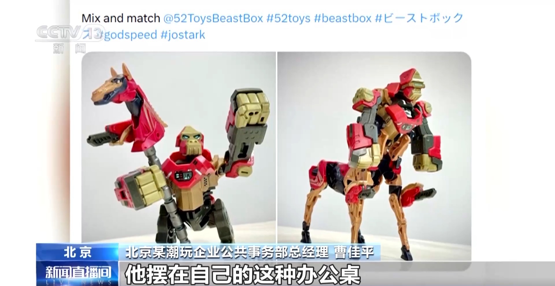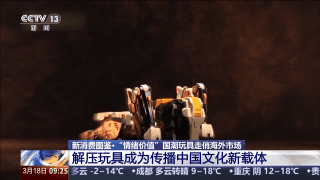北京某潮玩企业公共事务部总经理 曹佳平:老外拿到这款产品是非常兴奋,我在社交媒体上看见很多的消费者,把产品就当作艺术品一样,摆在自己的办公桌或者家里的写字台上,作为整体的艺术品来让自己得到欣赏和情绪的愉悦。