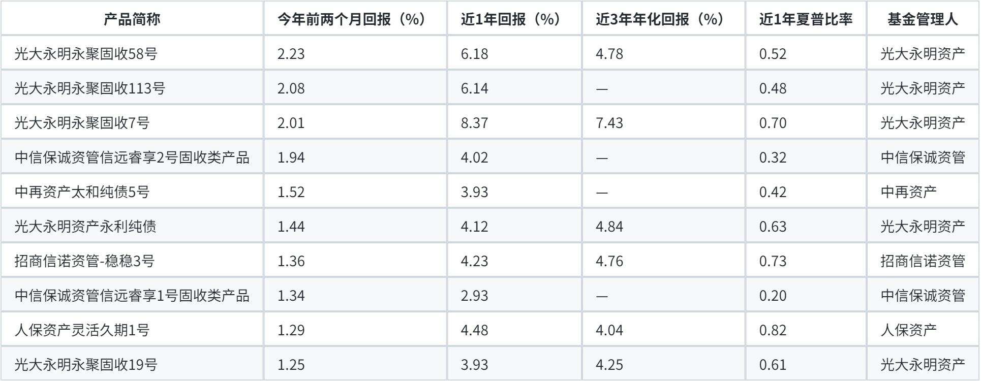 前两个月回报最高的纯债型保险资管产品为“光大永明永聚固收58号”,前两个月回报为2.23%,“光大永明永聚固收” 系列113号和7号分别排第二、第三,前两个月回报分别为2.08%、2.01%。