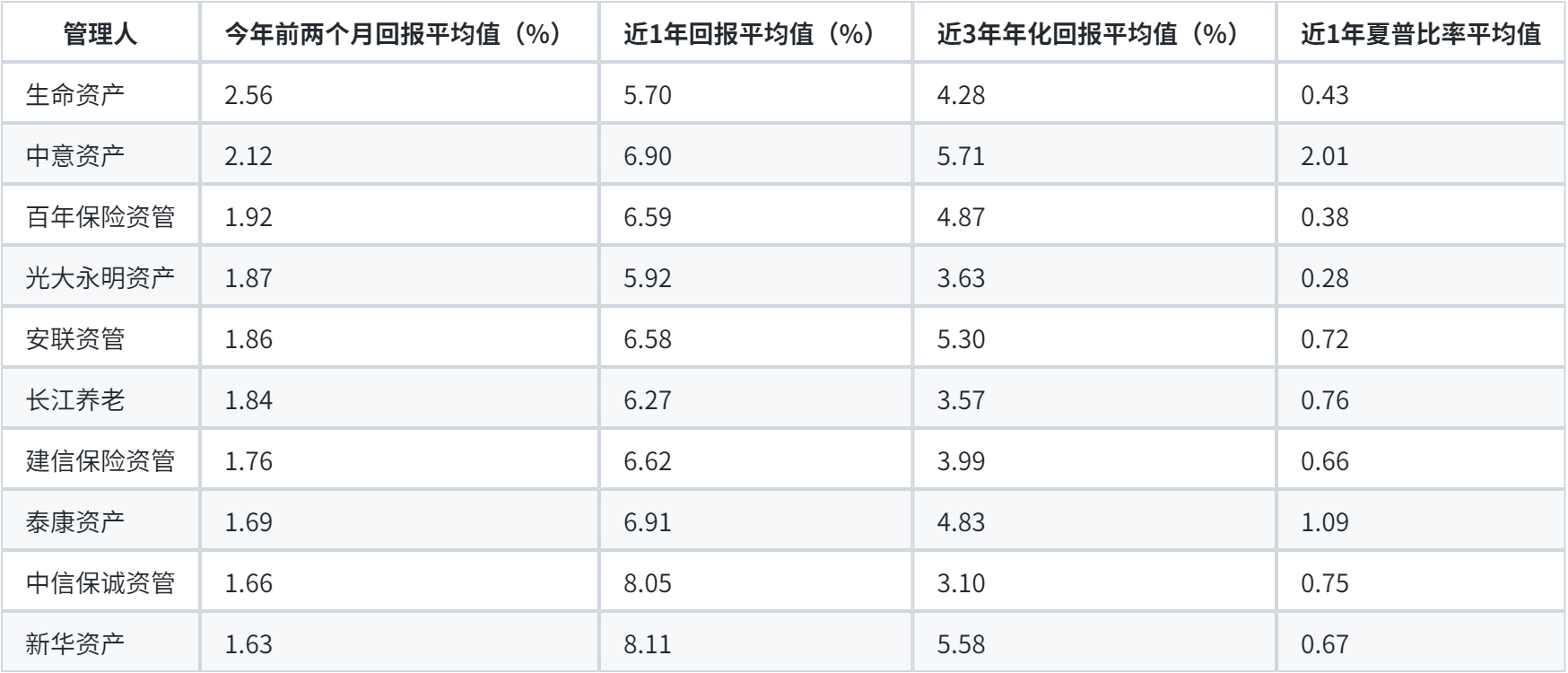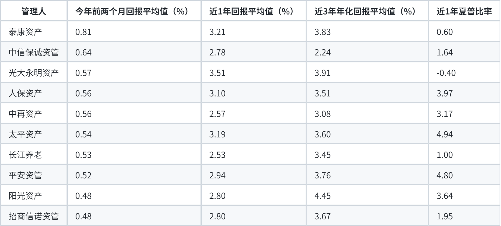 今年前两个月排名前十的保险资管公司,近1年回报不低的有新华资产、中信保诚资产等,近3年年化回报不低的有中意资产、新华资产等。