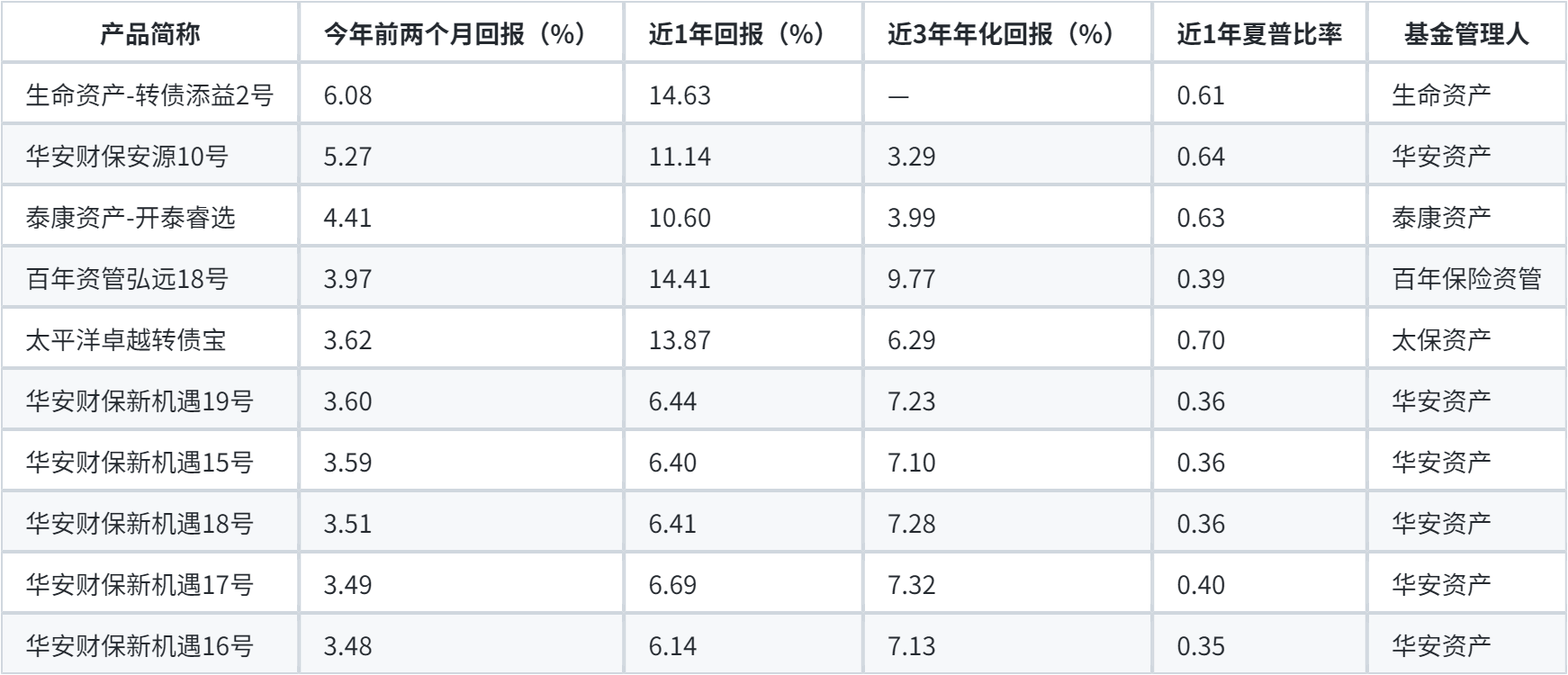 “海通可转债101号”“德邦心连心德盈5号”分别排第二、第三,今年前两个月回报分别为8.49%、8.41%。