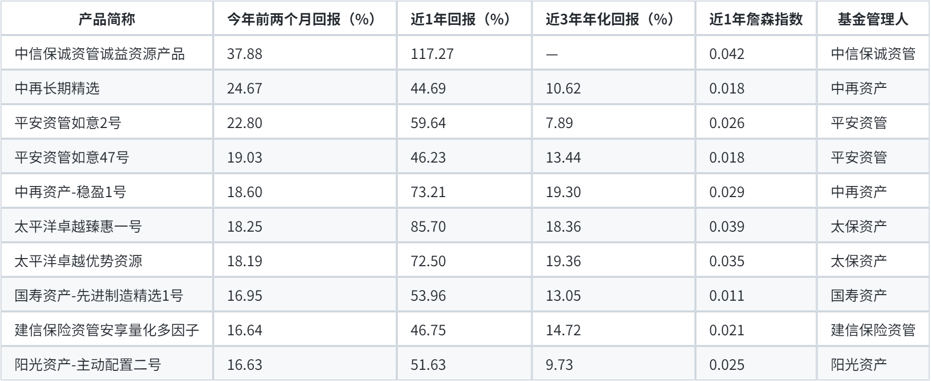 今年前两个月主动权益类产品平均回报居前的保险资管公司
