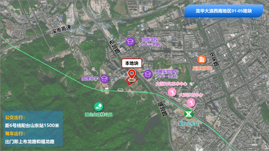 龙华大浪西南地区01-05地块位于龙华大浪片区,土地面积约2.33公顷,交通便利;周边生态资源丰富,背靠阳台山森林公园;周边有博雅实验学校、大浪体育中心、大浪文化艺术中心等公共设施配套,具备打造低密度、差异化产品的条件。