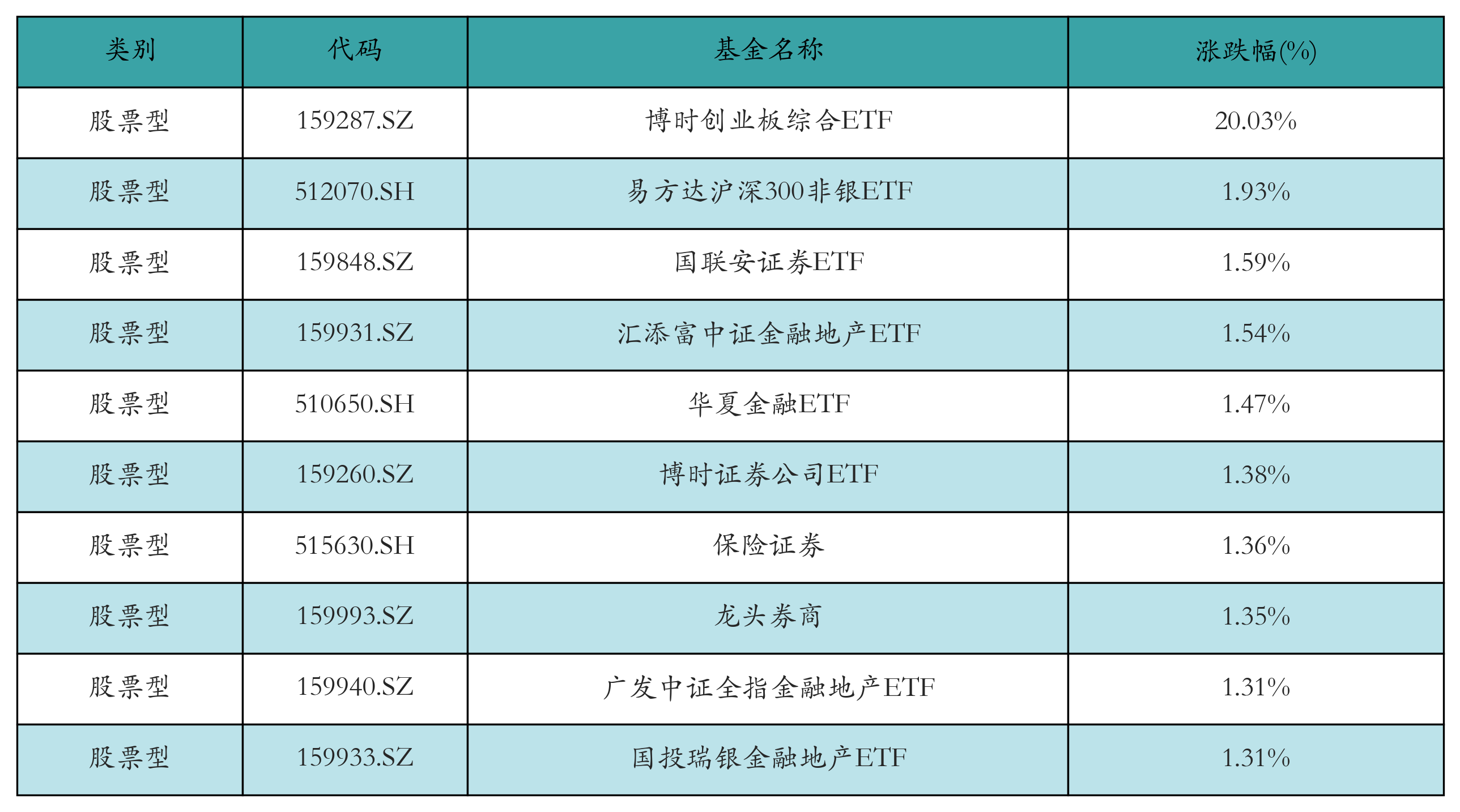 昨日股票型ETF涨幅最高的3只ETF及其收益率分别为:博时创业板综合ETF(20.03%)、易方达沪深300非银ETF(1.93%)、国联安证券ETF(1.59%)。涨幅前10详情见下表: