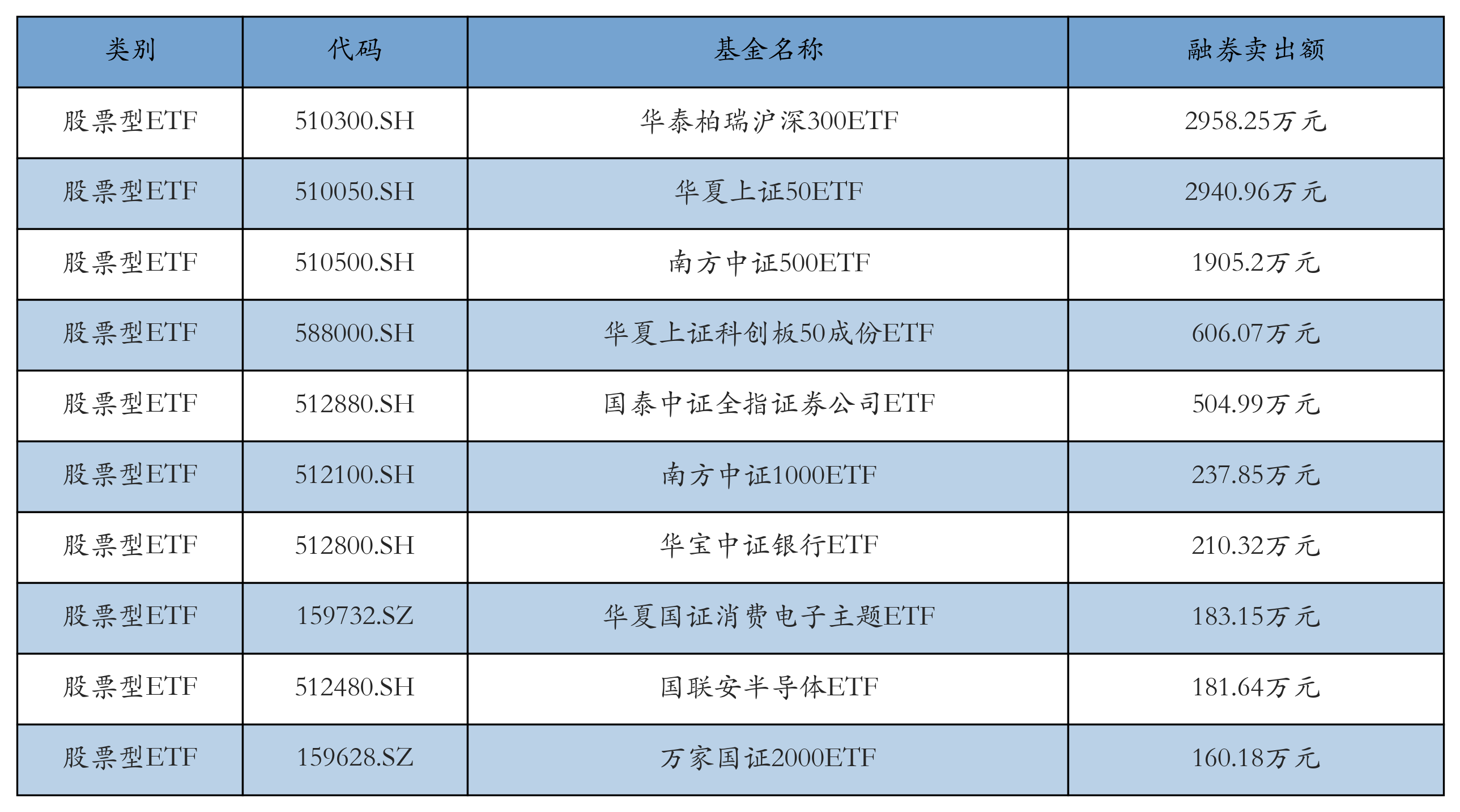 昨日股票型ETF融资卖出额最高的3只ETF及其卖出金额分别为:华泰柏瑞沪深300ETF(2958.25万元)、华夏上证50ETF(2940.96万元)、南方中证500ETF(1905.2万元)。融券卖出额前10详情见下表: