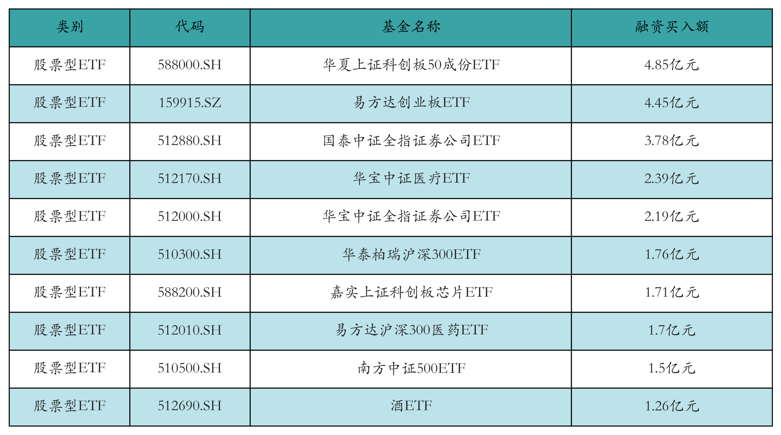 昨日股票型ETF融资买入额最高的3只ETF及其买入金额分别为:华夏上证科创板50成份ETF(4.85亿元)、易方达创业板ETF(4.45亿元)、国泰中证全指证券公司ETF(3.78亿元)。融资买入额前10详情见下表: