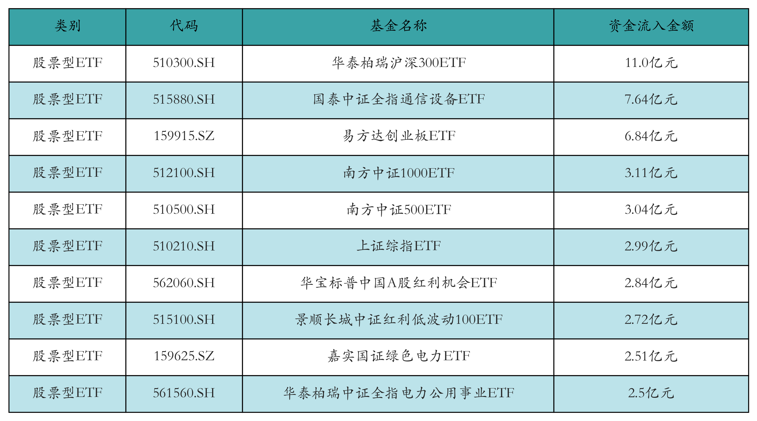 昨日股票型ETF资金流入最多的3只ETF及其流入金额分别为:华泰柏瑞沪深300ETF(流入11.0亿元)、国泰中证全指通信设备ETF(流入7.64亿元)、易方达创业板ETF(流入6.84亿元)。资金流入前10详情见下表: