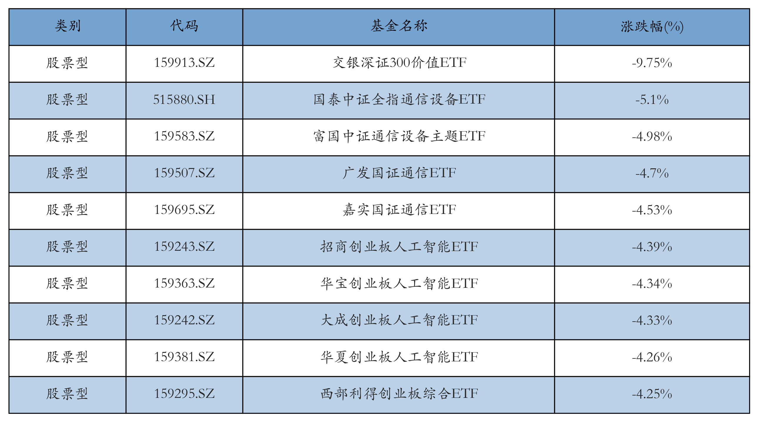 昨日股票型ETF跌幅最大的3只ETF及其收益率分别为:交银深证300价值ETF(-9.75%)、国泰中证全指通信设备ETF(-5.1%)、富国中证通信设备主题ETF(-4.98%)。跌幅前10详情见下表: