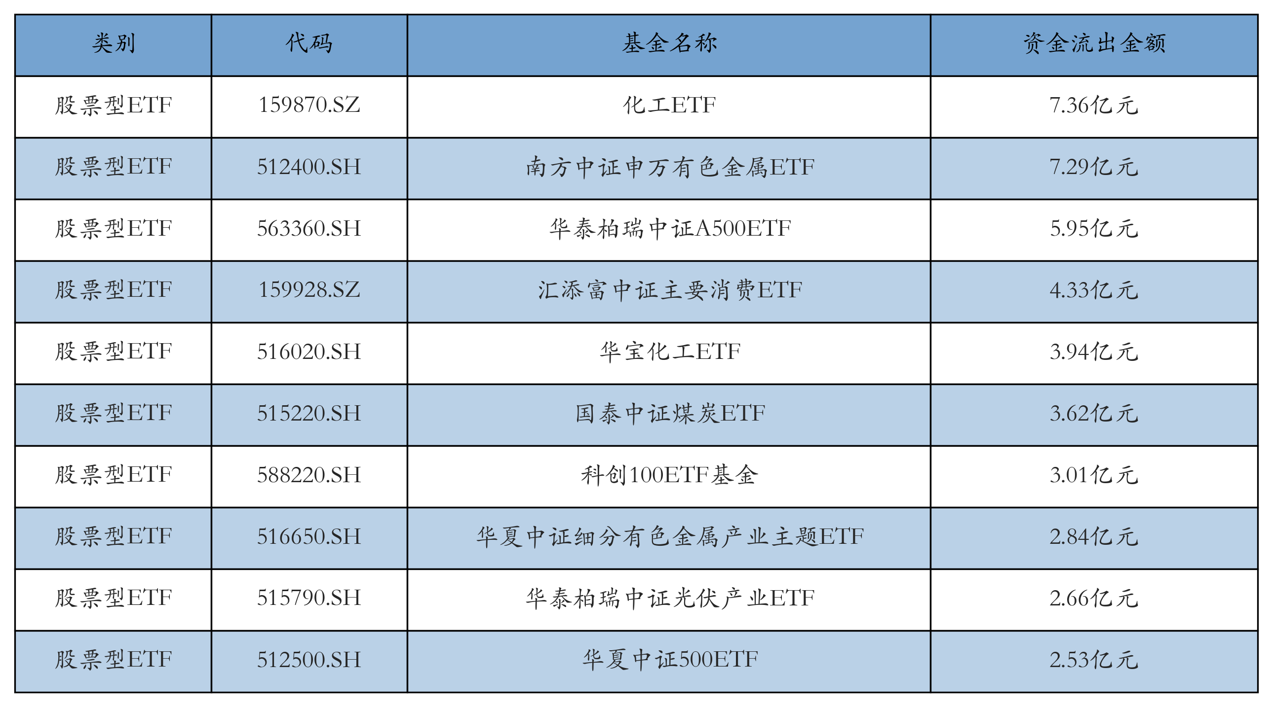 昨日股票型ETF资金流出最多的3只ETF及其流出金额分别为:化工ETF(流出7.36亿元)、南方中证申万有色金属ETF(流出7.29亿元)、华泰柏瑞中证A500ETF(流出5.95亿元)。资金流出前10详情见下表: