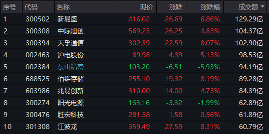 个股方面,新易盛成交额超129亿元居首,中际创旭、天孚通信、沪电股份成交额靠前。