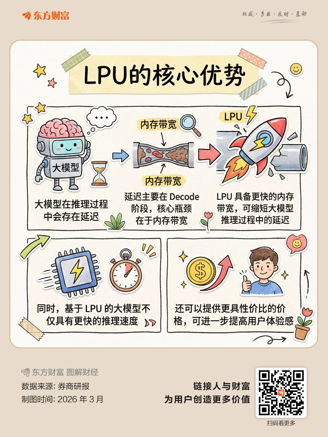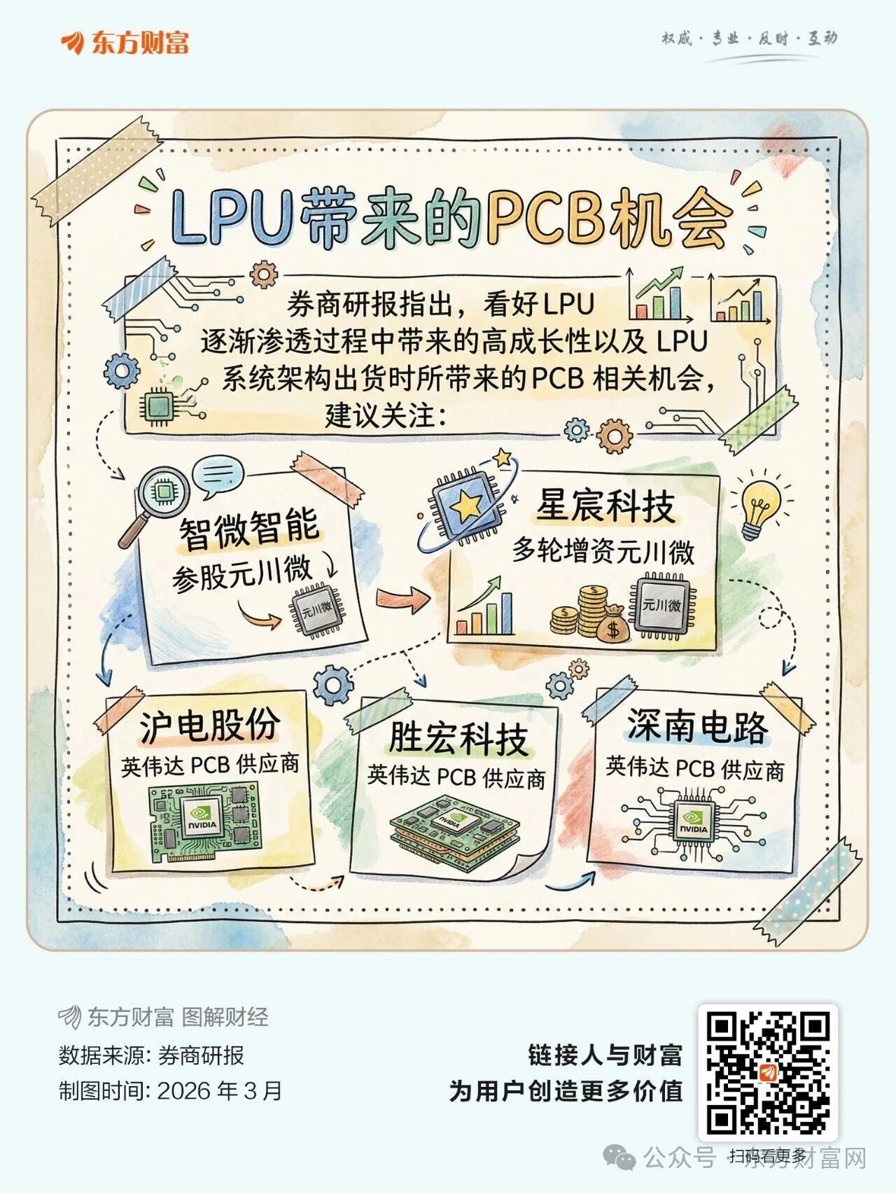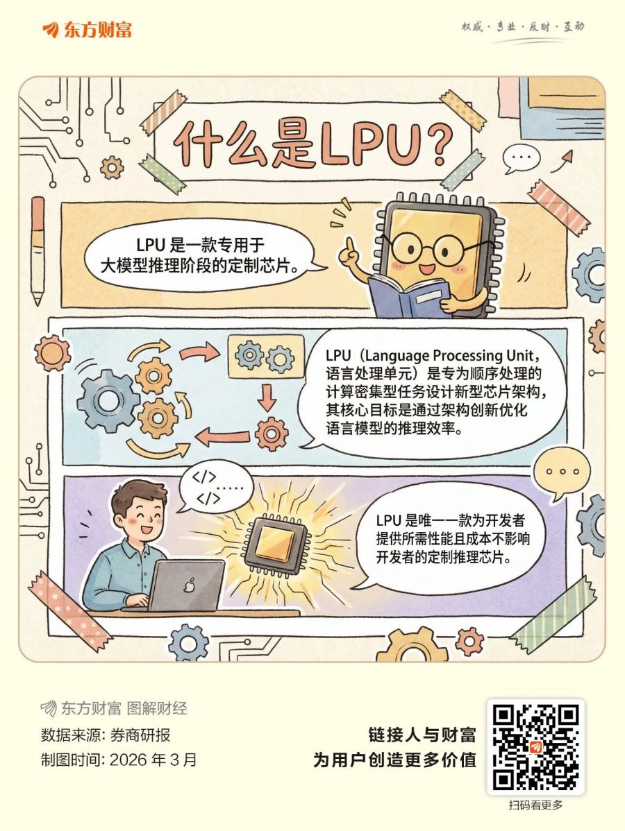 3月18日,A股PCB概念高开高走大涨2.62%,涨幅居概念板块前列。成分股中,金禄电子涨超10%,澳弘电子、奥士康、广合科技涨停,金安国纪、弘信电子涨超7%,鹏鼎控股、沪电股份、满坤科技、燕麦科技、东威科技涨超6%,大族数控、埃科光电、超声电子、四会富仕、天山电子、宏和科技等多股涨超5%。 消息方面,日前英伟达GTC 2026大会在美国加州圣何塞开幕,英伟达创始人兼首席执行官黄仁勋身披标志性黑色皮夹克登场,推出了一款看似小巧却极具战略意义的芯片——Groq 3语言处理单元(LPU)。 “LPU”意为“Language Processing Unit”,即语言处理单元。它是一款专用的AI推理加速芯片,基于NVIDIA去年收购的Groq,专攻低延迟解码与交互式推理,与主打训练和通用计算的GPU形成互补,共同支撑AI从训练到落地的全流程。 据黄仁勋描绘的GPU与LPU协同工作的未来图景:Vera Rubin(集成了72颗Rubin GPU和36颗Vera CPU)负责需要海量计算的“预填充”阶段,而Groq LPU则负责对延迟极度敏感的“解码”阶段。在这种混合架构下,系统的推理吞吐量与功耗比最高可提升35倍。 券商研报指出,随着 AI Agent(智能体)时代到来,推理需求将持续高增长。2026 年全球 AI 芯片市场规模预计达 2800 亿美元,其中推理芯片占比 52%,规模约 1450 亿美元,年复合增速超 50%,而 LPU 在能效比、性价比、时延等方面显著优于GPU,有望成为推理市场的主导技术路线。看好 LPU 逐渐渗透过程中带来的高成长性以及 LPU 以系统架构出货形式时所带来的 PCB 相关机会。