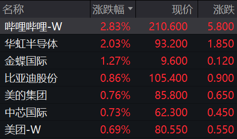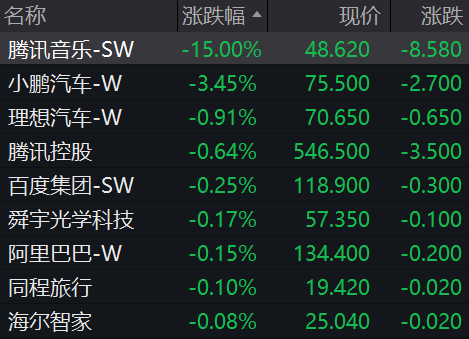 科网股走势分化,哔哩哔哩、华虹半导体涨逾2%;腾讯音乐跌15%,小鹏汽车跌逾3%,腾讯控股、百度集团、阿里巴巴走低。