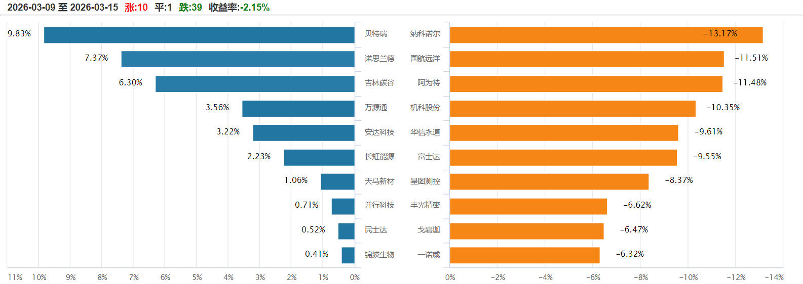 其中,贝特瑞(920185)涨幅居首,上涨9.83%,诺思兰德(920047)居次,上涨7.37%;纳科诺尔(920522)跌幅居首,下跌13.17%,国航远洋(920571)居次,下跌11.51%。