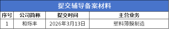 和烁丰公告显示,2026年3月13日,公司向江苏监局报送了辅导备案申请材料,辅导机构为国投证券。