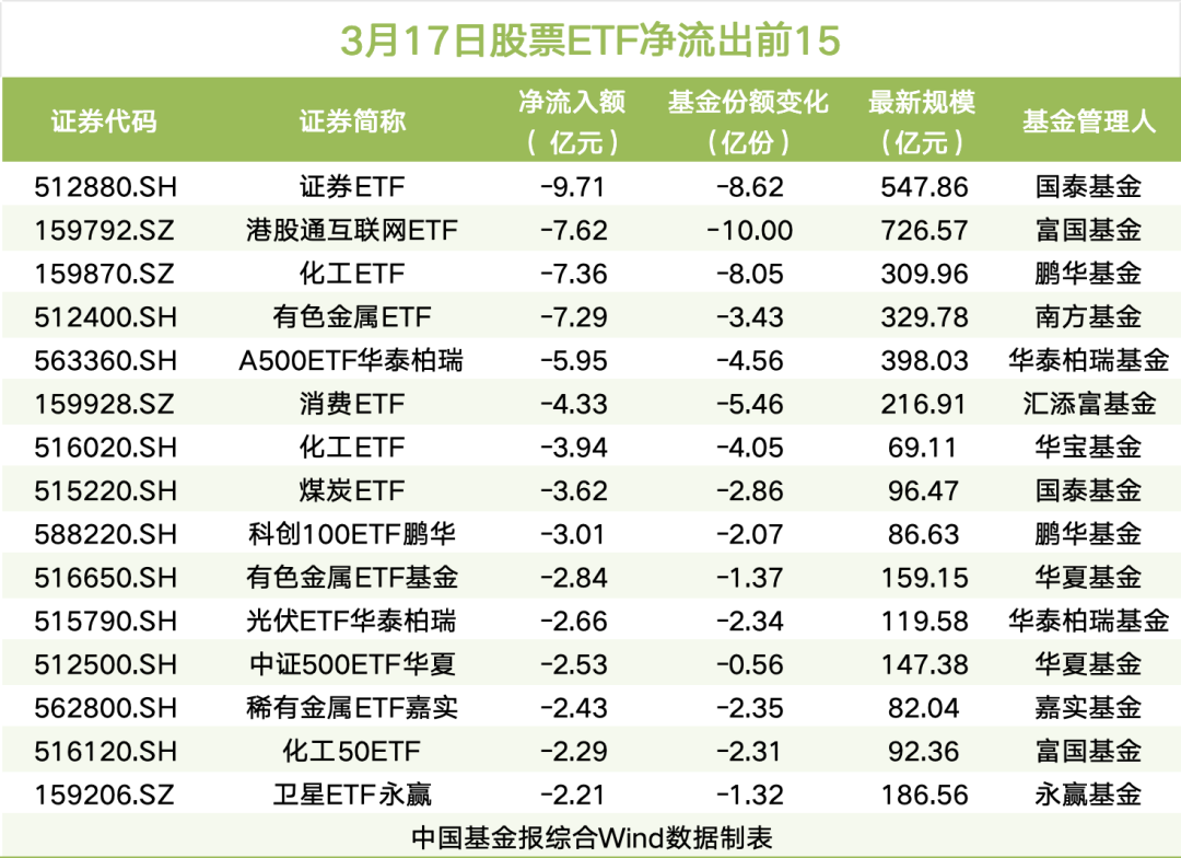 3月17日,A股三大指数集体收跌。股票ETF市场资金延续净流出态势,当日净流出超24亿元。