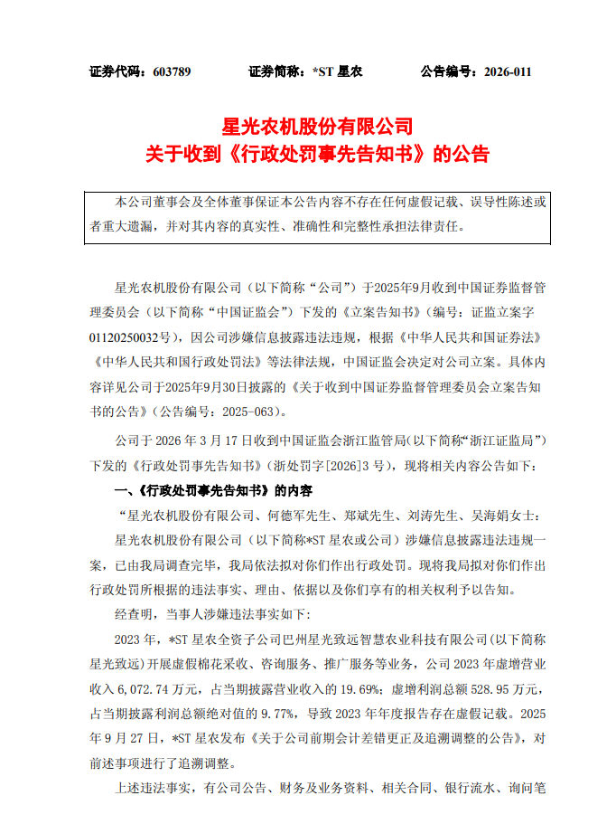 2026年3月18日,星光农机股份有限公司(*ST星农,证券代码:603789)连续发布公告,公司收到浙江证监局出具的《行政处罚事先告知书》,因2023年年度报告存在虚假记载被拟处罚,同时公司股票自3月18日起被叠加实施其他风险警示,公司已处于退市风险警示和其他风险警示双重压力之下。