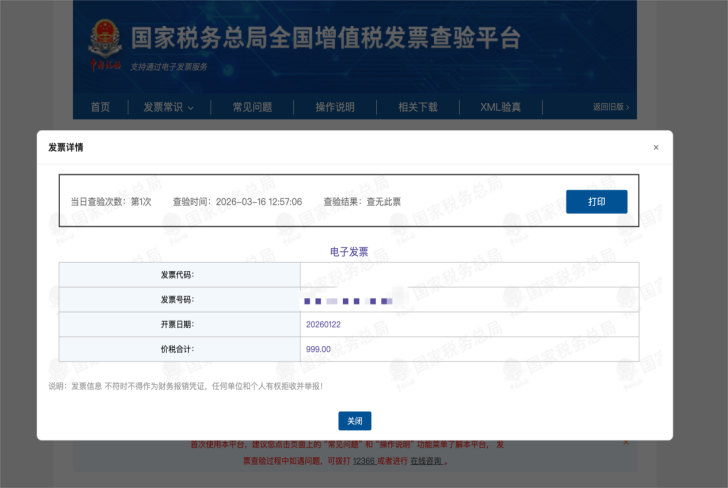 全国增值税发票查验平台与支付宝发票验真功能显示结果