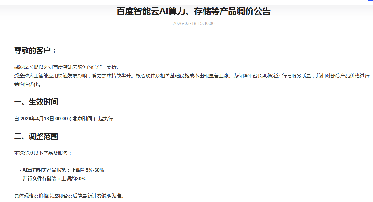 3月18日A股盘后消息,百度智能云发布AI算力、存储等产品调价公告称,受全球人工智能应用快速发展影响,算力需求持续攀升。核心硬件及相关基础设施成本出现显著上涨。为保障平台长期稳定运行与服务质量,对部分产品价格进行结构性优化。