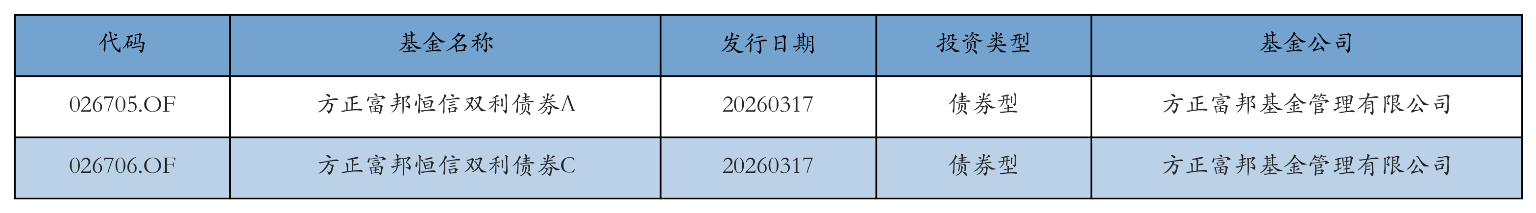 昨日有2只新基金发行,分别为:方正富邦恒信双利债券A、方正富邦恒信双利债券C,详情见下表: