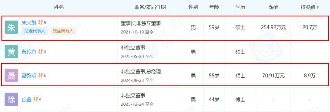 2025年,朱文凯的薪酬为254.92万元,升职加薪。前一年他作为总经理,年薪为232.35万元。