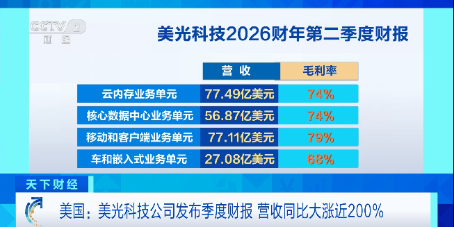 美光科技当天发布的财报显示,在截至今年2月26日的2026财年第二季度,公司营收达到238.6亿美元,环比上涨约75%,同比上涨约196%;净利润为137.85亿美元,环比上涨约163%,同比上涨约771%。在该季度,公司的云内存、核心数据中心等四大业务单元均实现大幅盈利,毛利率在68%至79%之间。报告还说,展望2026财年第三季度,美光科技预计营收将达到约335亿美元,远高于市场此前预期。