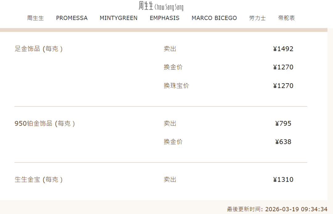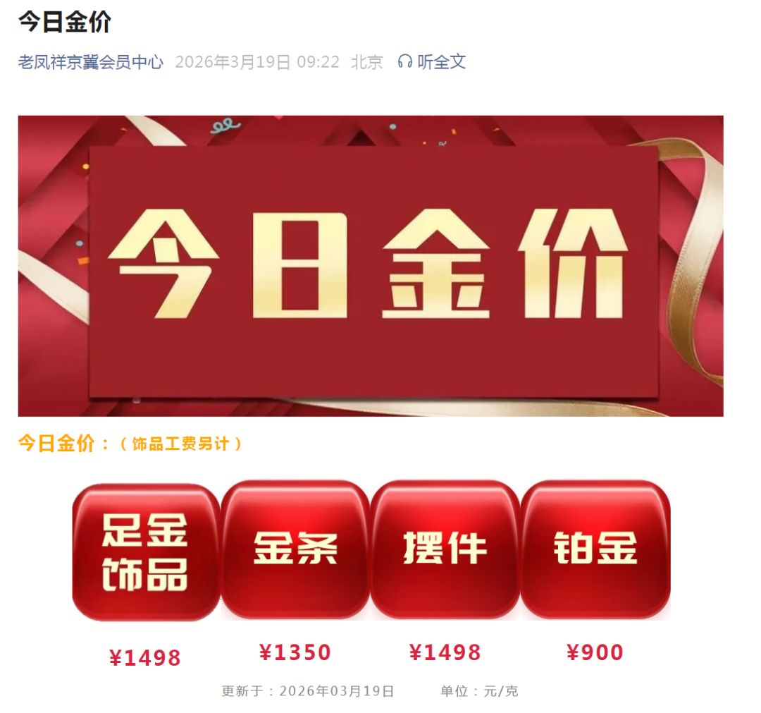 受此影响,国内金饰价格也大幅下跌。中新经纬19日查询发现,周生生金饰1492元/克,单日跌55元;相较3月3日月内高点跌158元。老庙黄金金饰1507元/克,单日下跌43元,相较月内高点跌135元;老凤祥为1498元/克,单日跌42元,相较月内高点跌144元。