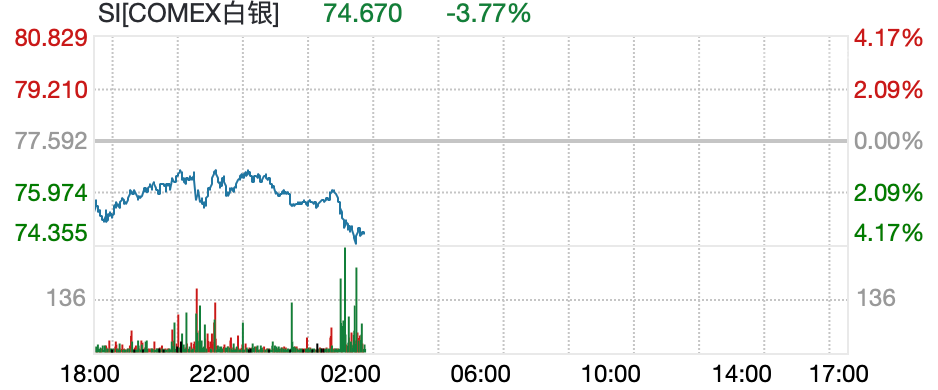 3月19日午后,白银急跌,截至14:30左右,现货白银跌近3%,跌破74美元/盎司;纽约期银日内跌幅扩大至3.77%。现货黄金翻绿,日内下跌0.3%,跌破4800美元关口。