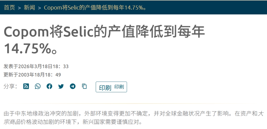 【导读】巴西央行下调利率25个基点,降至14.75% 中国基金报记者 晨曦 大家好!继续一起关注海外央行的最新动态~ 当地时间3月18日,巴西中央银行货币政策委员会(Copom)宣布,将基准利率(Selic)下调25个基点,降至14.75%。