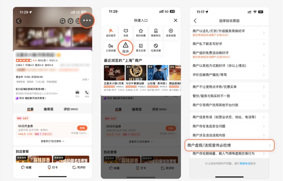 ▲ 大众点评“必吃榜”开放消费者举报通道,避免消费踩坑(图源:大众点评App)