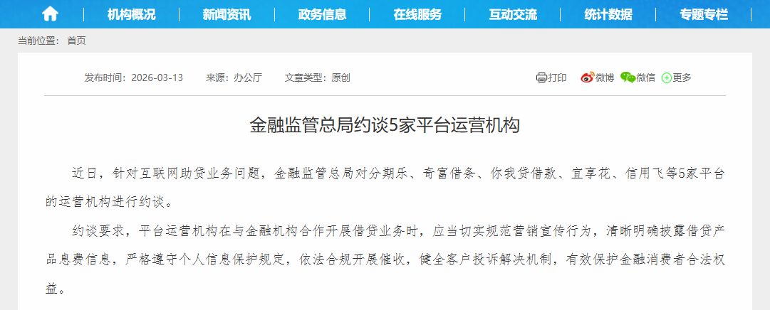 五家平台被金融监管总局约谈,本就不是一件会在行业里被轻描淡写的事情。单独看这一《约谈》,本身分量够重。而将其与近日发布的综合融资成本明示新规、年初发布的催收指引结合在一起看,分量则更重。前端营销、息费呈现、个人数据、催收边界、申诉受理,过去常被分在不同部门、不同页面、不同合作方手里,如今却被监管重新拢成一件事,谁先面对借款人,谁就先扛责任。