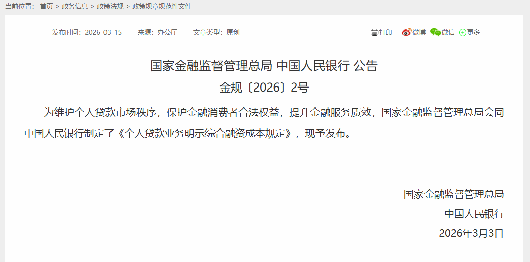 就在五平台被监管约谈不久,国家金融监督管理总局会同中国人民银行制定的《个人贷款业务明示综合融资成本规定》正式发布,自2026年8月1日起施行。这项新规共11条,目的很直接,就是解决个人贷款业务息费披露不规范、不透明的问题,要求贷款人向借款人展示综合融资成本明示表。约谈通报与《规定》接连落地,前端营销与息费披露环节的要求更细,借款前集中展示综合融资成本明示表成为硬要求。