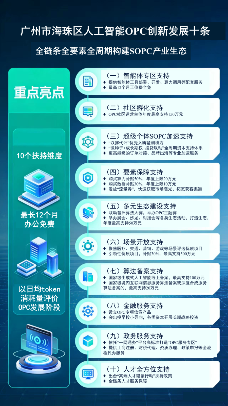 3月19日,南方财经记者从广州市海珠区获悉,海珠区近期将发布OPC(One Person Company,即一人公司)创新发展十条,在全国首创SOPC产业生态,以Smart(超级智能)、Solution(解决方案)、Save(降本增效)、Scene(应用场景)4S为核心,从十大维度提供全链条、全周期扶持。据了解,政策包含每年最长12个月办公优惠,以日均token消耗量评价OPC发展阶段,对于引领性优质项目补贴30%,最高支持500万元。