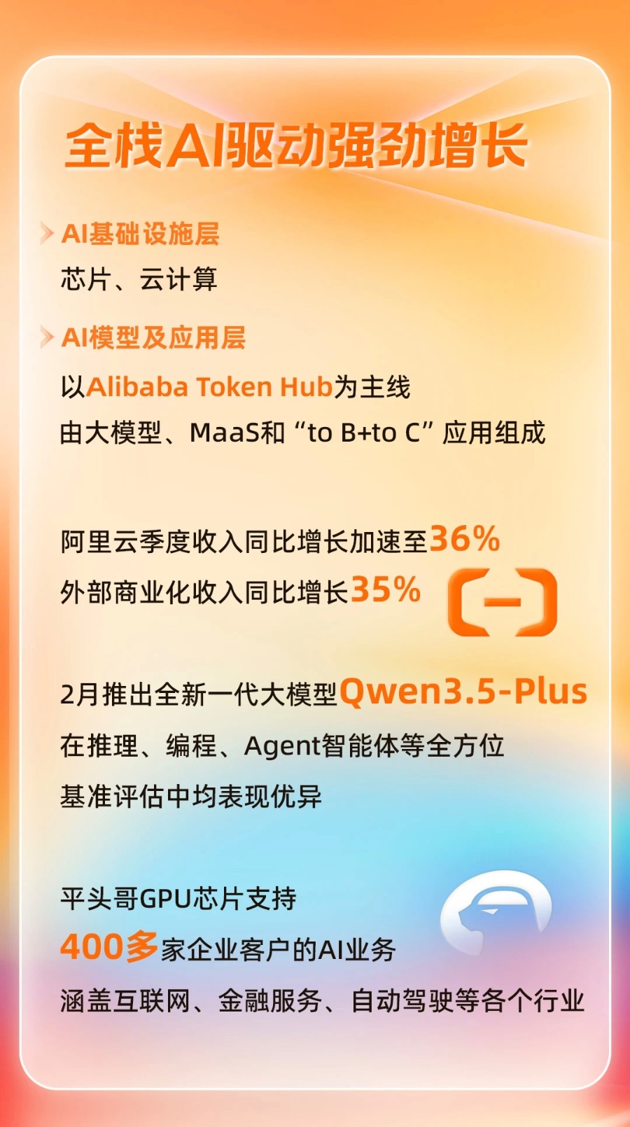 在芯片层,平头哥首次在阿里财报中亮相。平头哥自研GPU已实现规模化量产,支持阿里内部业务,并通过阿里云向外部数百家企业客户提供商业化服务,已为云基础设施供应带来实质性贡献。