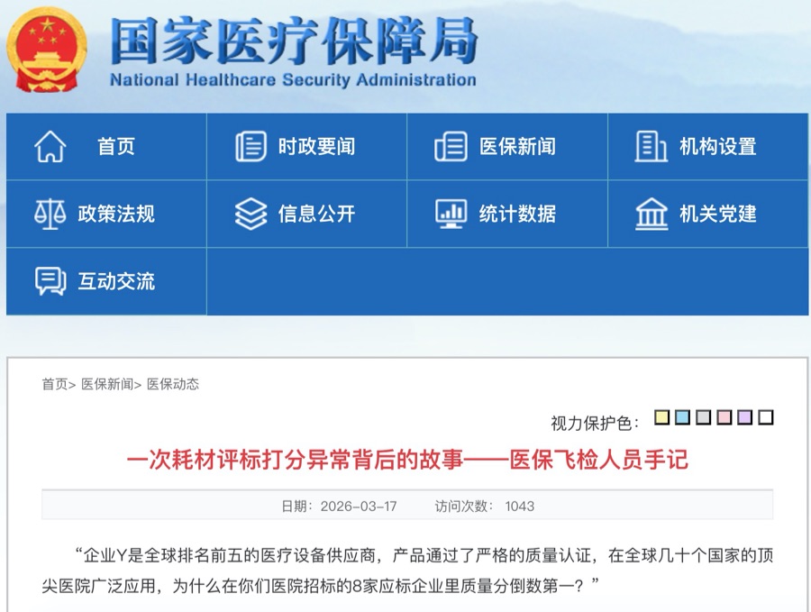 3月17日,国家医保局发布《一次耗材评标打分异常背后的故事——医保飞检人员手记》,首次详细披露一起医用耗材招标造假典型案例:某医院数千万元耗材采购项目中,全球行业龙头企业因评标专家被人为干预打分,最终以1分之差垫底出局,而评标过程中存在的分数涂改、统一压分等违规行为,直指医用耗材招标领域的权力寻租与监管漏洞。